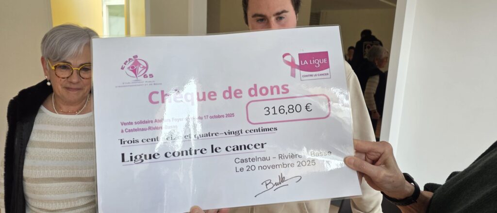 Ce mardi 3 mars 2026, un petit groupe de résidents et de moniteurs éducateurs du foyer de vie de l’Établissement Public d’Accompagnement et de Soins des Hautes-Pyrénées (EPAS 65) est venu au siège de la Ligue contre le cancer pour remettre le fruit de leur mobilisation d’Octobre Rose : un chèque de 316,80 €.