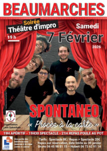 La troupe Spontaneo vous embarque dans un “Procès à la carte”, un spectacle 100 % improvisé, drôle et interactif, où le public a son mot à dire.📅 Samedi 7 février à 19h : apéritif, spectacle, puis repas convivial (poule au pot).❤️ Une partie des bénéfices sera reversée à la Ligue contre le cancer.Rires garantis, bonne cause assurée !